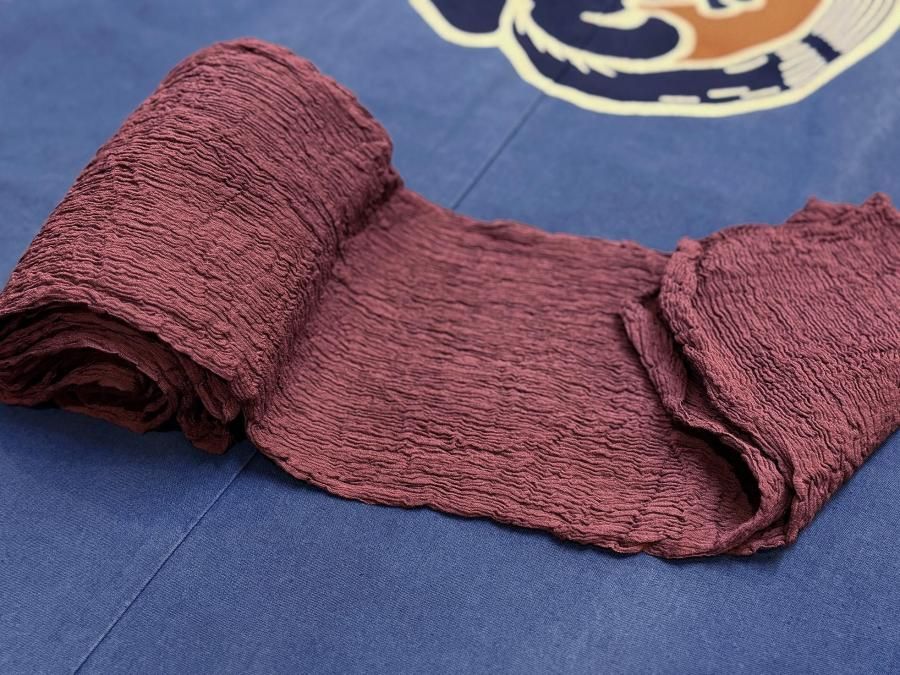 生地に縮みを持たせています、ムラ染め巻き帯です。後ろで「ふわっ」と結んでも 前で結んでも 上手く巻いて下さい。